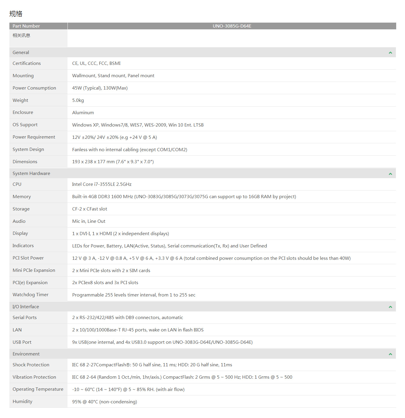UNO-3085G是板載 Intel Core i7-2655LE, 2.2 GHz處理器,支持雙顯示、帶9個USB接口、2個Mini PCIe插槽、2個CFast卡插槽的可擴展型嵌入式無風扇工業(yè)電腦系列。它具有雙電源冗余設計與繼電器報警設計。此外,UNO-3085G前面板有兩個支持RAID 0/1的HDD/SSD支架,方便安裝、拆卸,兩個千兆以太網(wǎng)口具有錯容能力、負載均衡、鏈路聚合的網(wǎng)絡分組能力。UNO-3000G內置智能BIOS,通過繼電器功能或LED顯示,可及時診斷系統(tǒng)狀態(tài)。