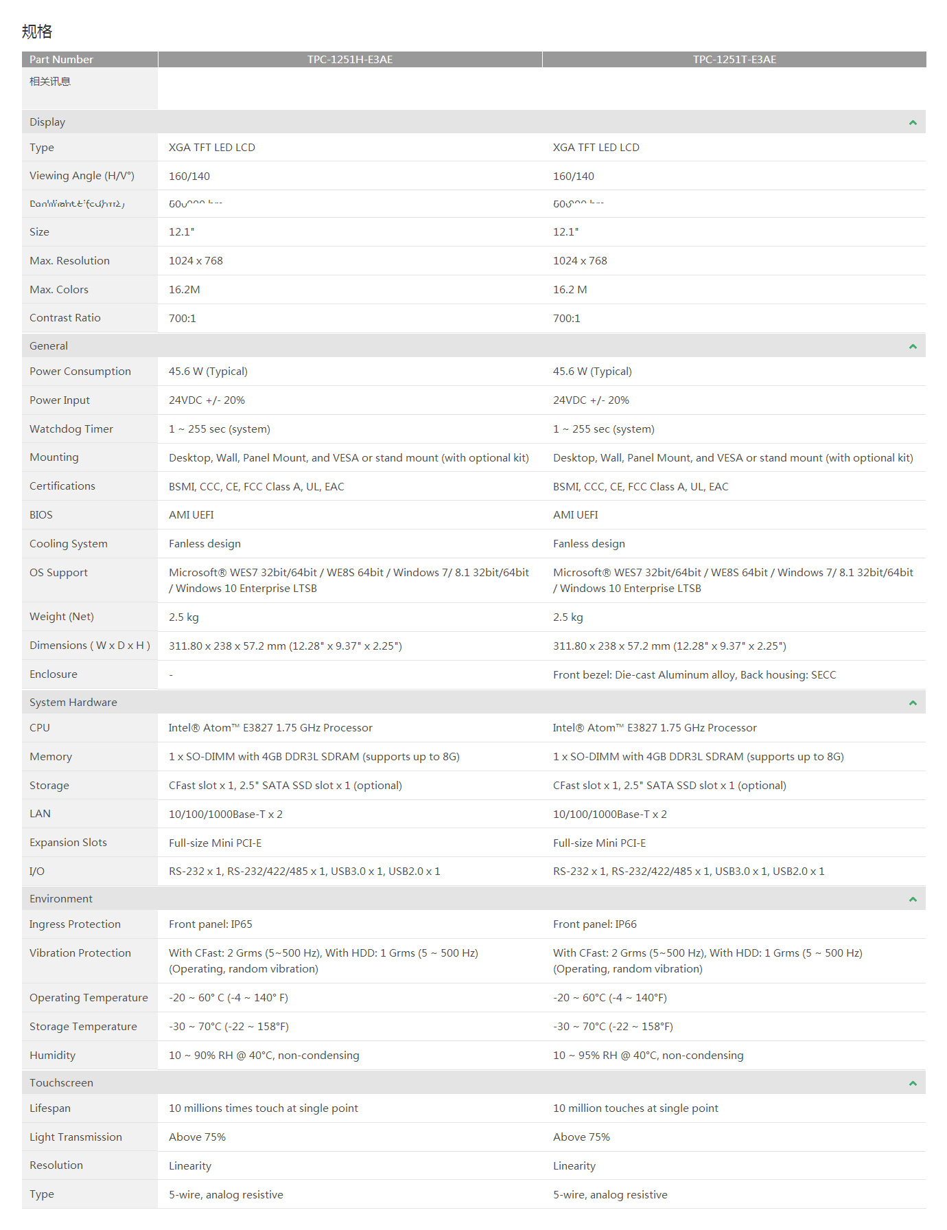 研華TPC-1251T瘦客戶端平板電腦采用低功耗嵌入式英特爾®Atom™e3827 1.75 GHz雙核處理器、以及最高達(dá)8G DDR3L內(nèi)存,具有緊湊、無風(fēng)扇的特點。TPC-1251T裝配了具有IP66防水等級的12.1寸全平面5線電阻觸摸屏,并支持- 20 ~ 60°C寬工作溫度,耐久性更強(qiáng)。TPC-1251T可完美兼容全尺寸迷你PCIe卡,滿足各種自動化應(yīng)用的需求;并可通過與研華iDoor模塊相互搭配實現(xiàn)對3G / GPS / GPRS / WiFi通信和電池備份MRAM等功能的豐富擴(kuò)展。