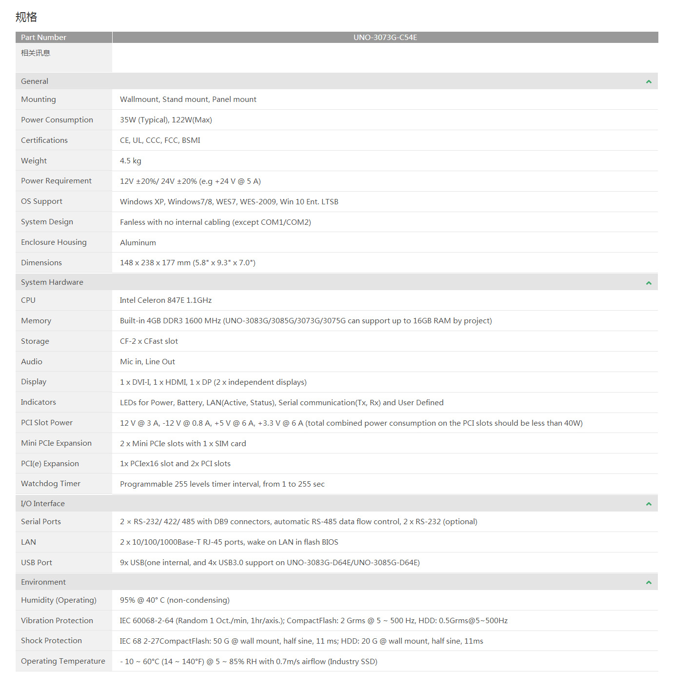 UNO-3073G是板載 Intel Celeron 847E,1.1GHz處理器,支持雙顯示、帶9個(gè)USB接口、2個(gè)Mini PCIe插槽、2個(gè)CFast卡插槽的可擴(kuò)展型嵌入式無(wú)風(fēng)扇工業(yè)電腦。它具有雙電源冗余設(shè)計(jì)與繼電器報(bào)警設(shè)計(jì)。此外,前面板有兩個(gè)支持RAID 0/1的HDD/SSD支架,方便安裝、拆卸,兩個(gè)千兆以太網(wǎng)口具有錯(cuò)容能力、負(fù)載均衡、鏈路聚合的網(wǎng)絡(luò)分組能力。UNO-3073G內(nèi)置智能BIOS,通過繼電器功能或LED顯示,可及時(shí)診斷系統(tǒng)狀態(tài)。